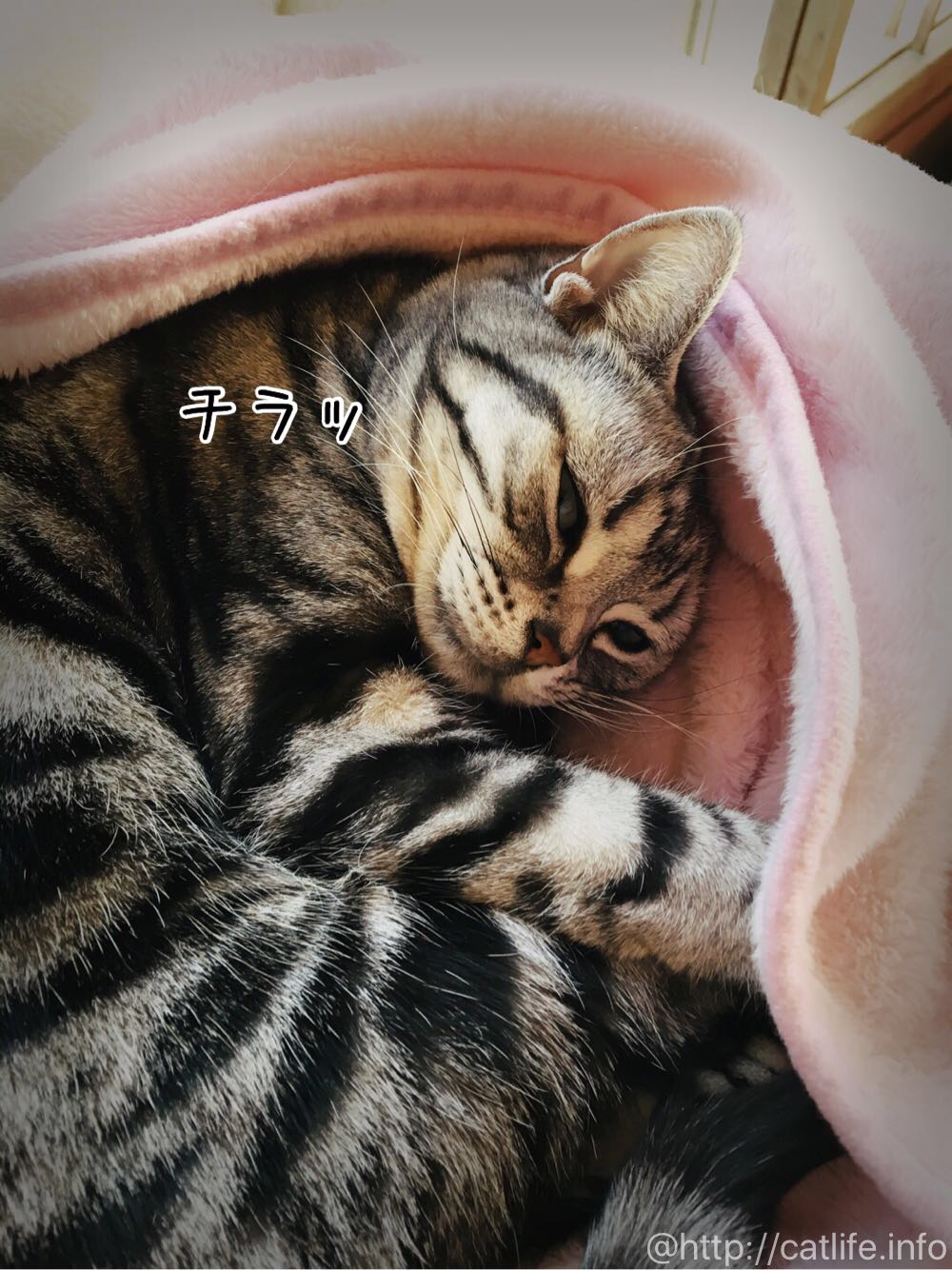 冬は寒いので、ベッドの他に、ピンクのお布団をかぶって寝るアメショーさくらたん。
